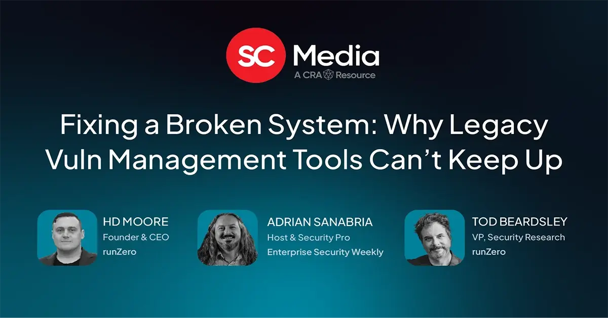 Hear from runZero’s HD Moore and Tod Beardsley, along with SC Media’s Adrian Sanabria, for a discussion on how today’s vulnerability management tools leave up to 40% of enterprise assets invisible.