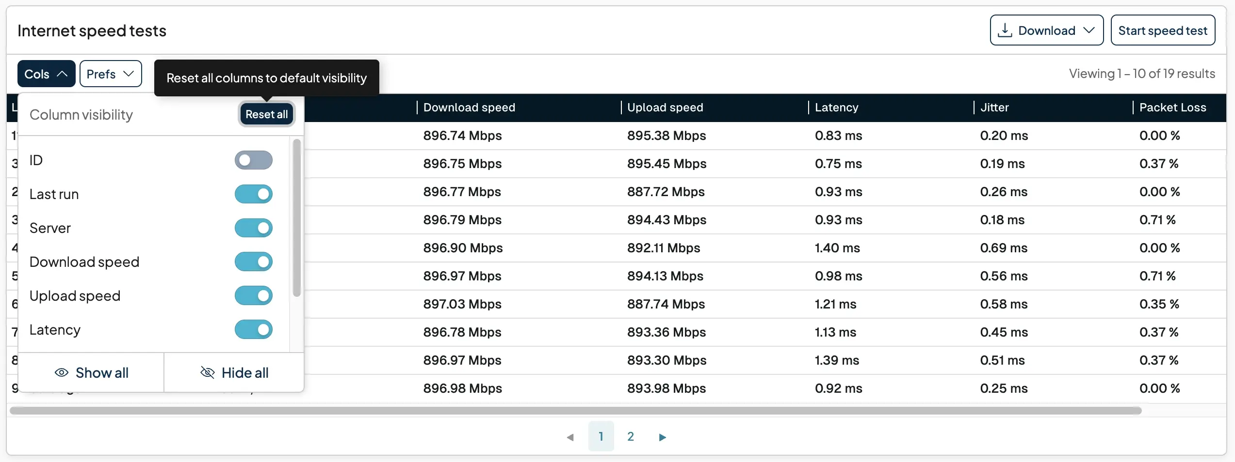 You can also set column visibility, and table preferences from within the Internet Speed tests page. So, that you can make sure you are seeing what is most important to you, and how you want to view the data within the grid.